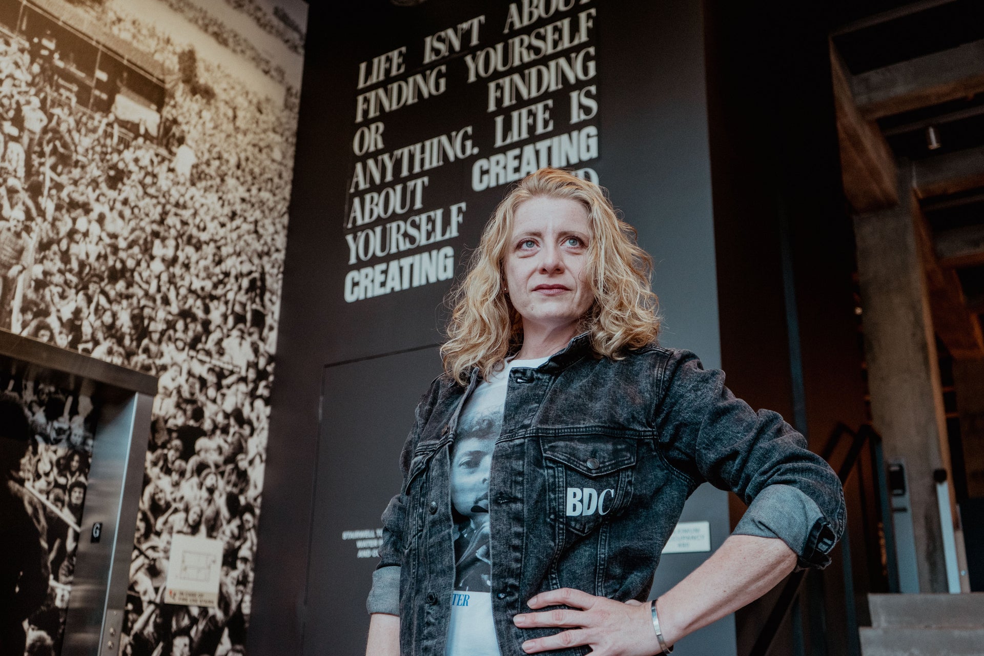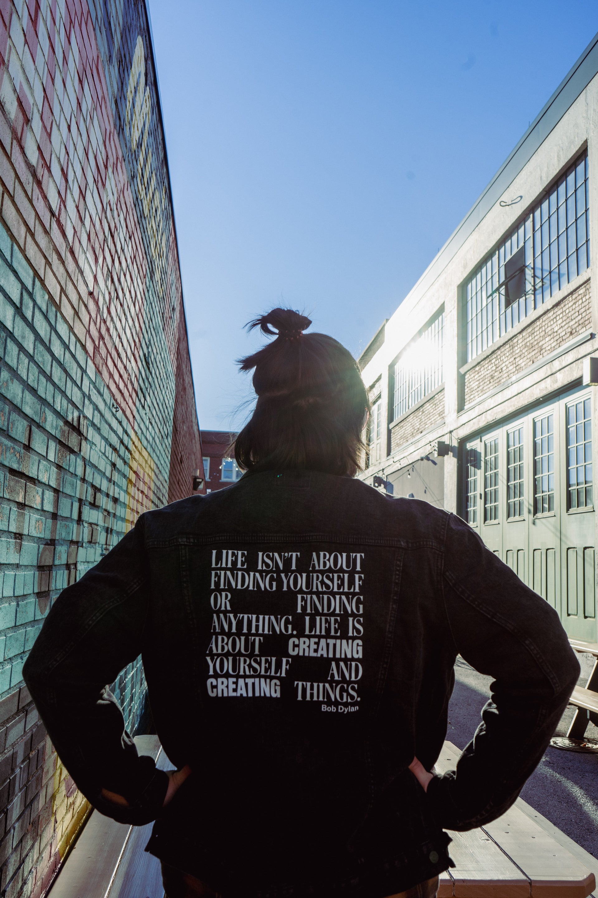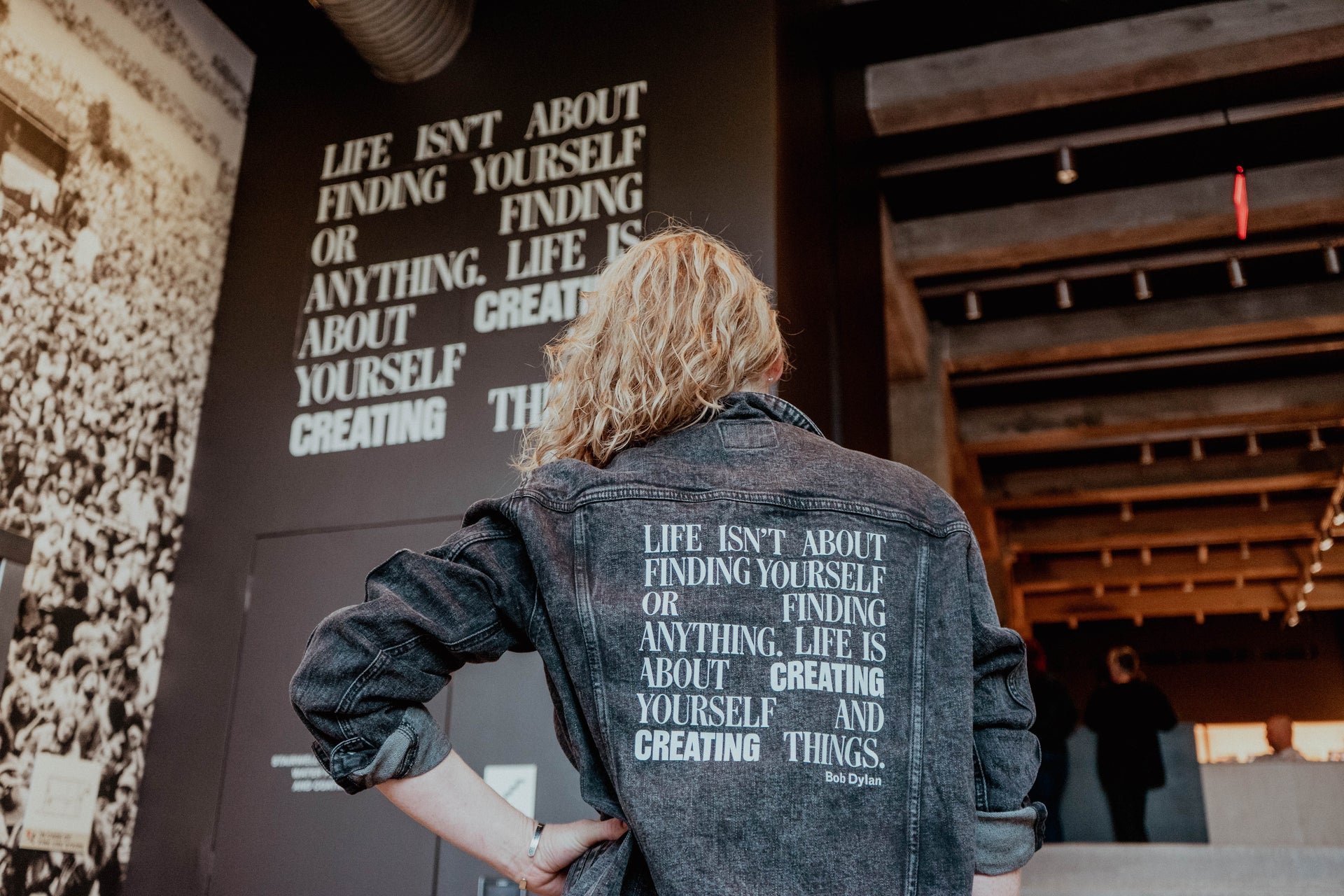 Our 100% cotton black denim Creating Yourself pays homage to Dylan and that restless creativity we celebrate at the Bob Dylan Center.