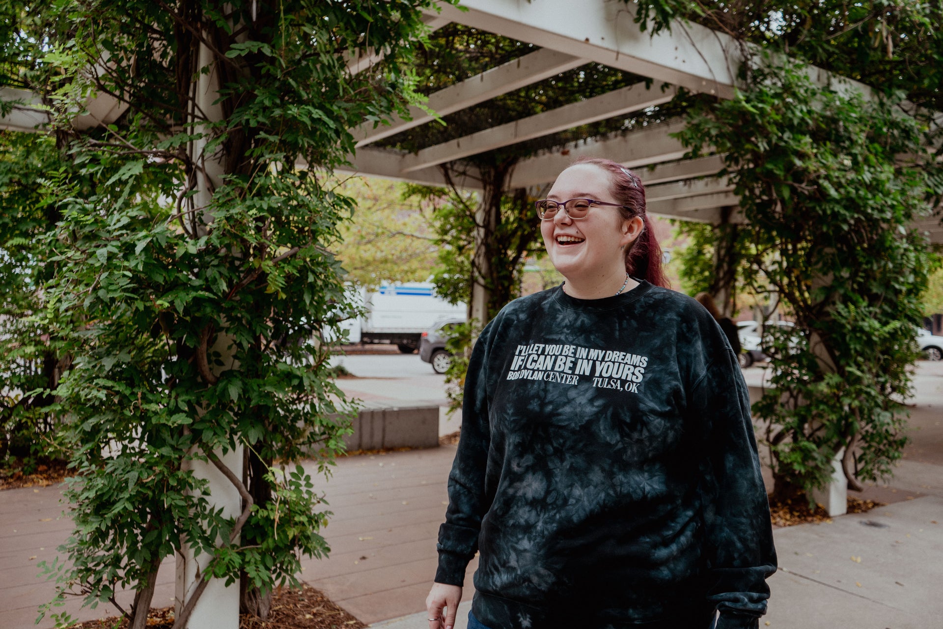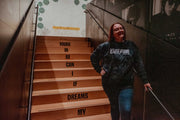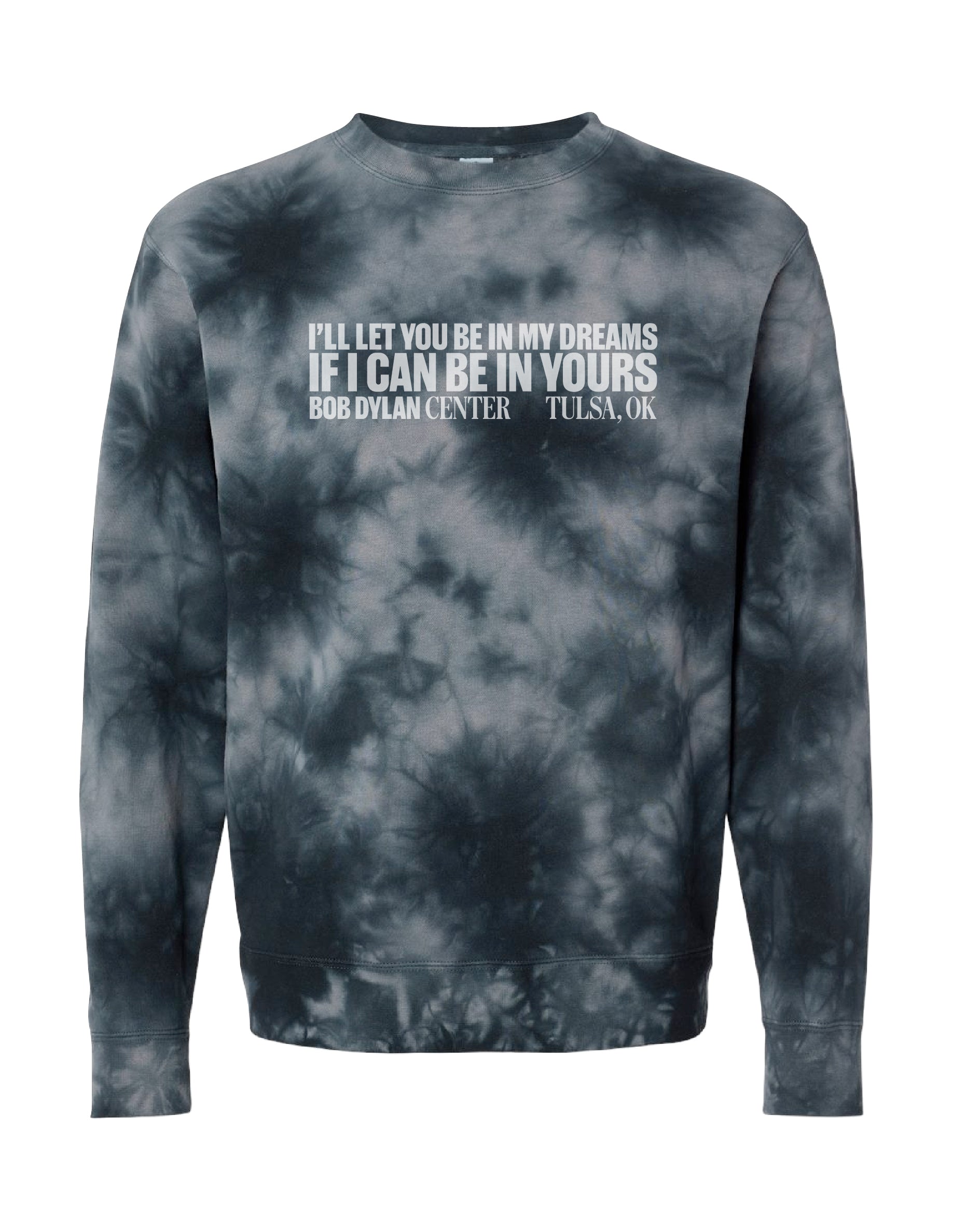 Our mid-weight Dreams Sweatshirt features lyrics from Bob Dylan's song, Talkin' World War III Blues, which is also displayed on the Bob Dylan Center staircase. Each garment is unique with slight differences in the navy and grey tie-dye pattern.