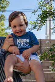 May your little one stay forever young with our new onesie! Available in indigo blue, this onesie is super soft and perfect for babies 6 months to 24 months.