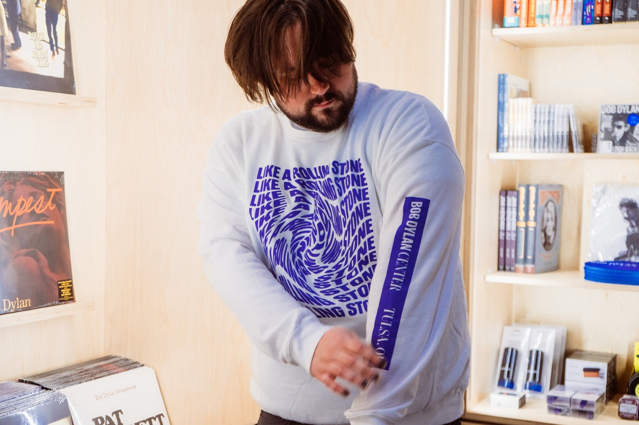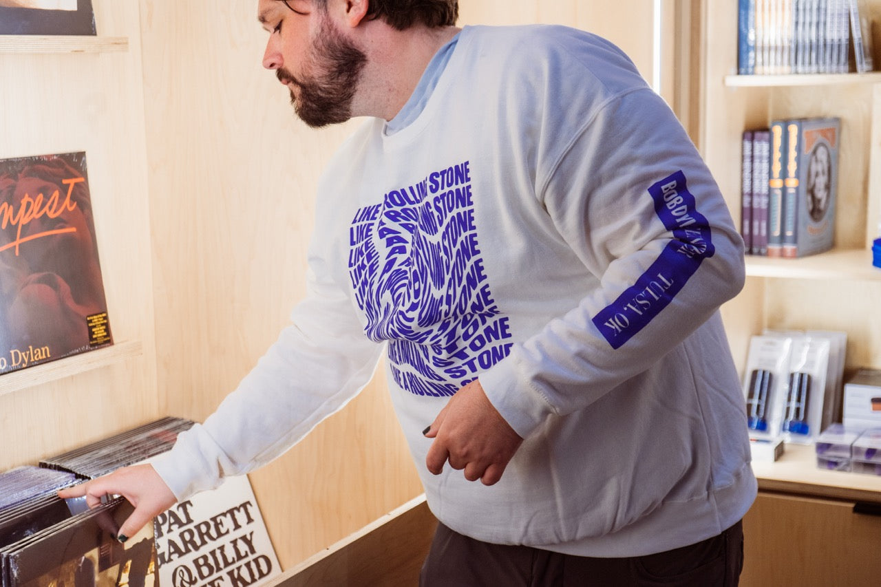 Fleece, white crewneck sweatshirt, with the text "Like a Rolling Stone" in psychedelic blue print. Featuring the Bob Dylan Center® in blue along the sleeve.