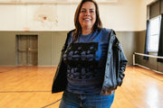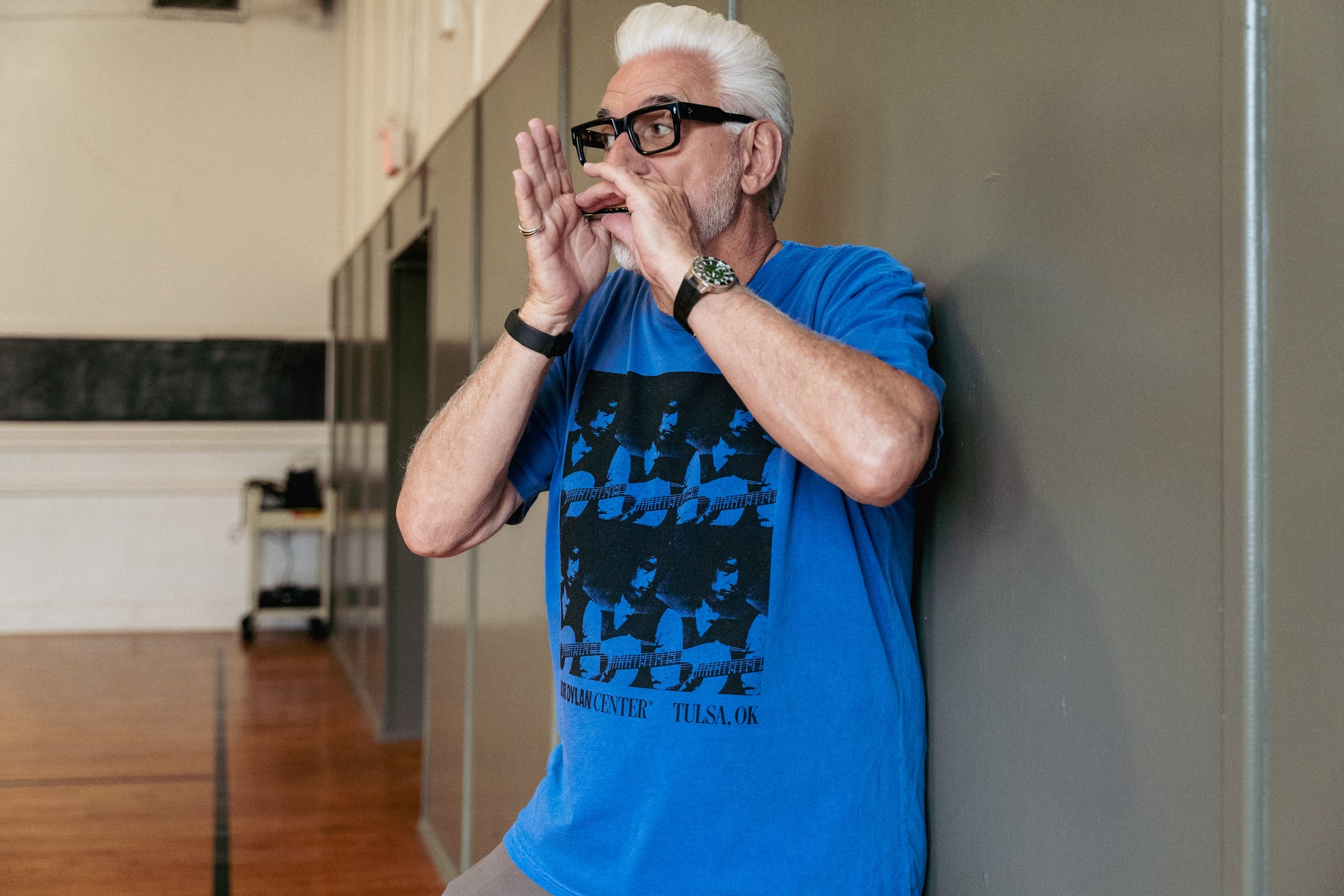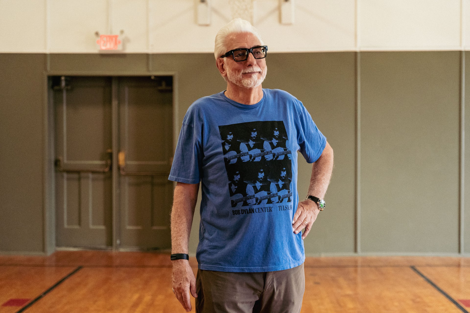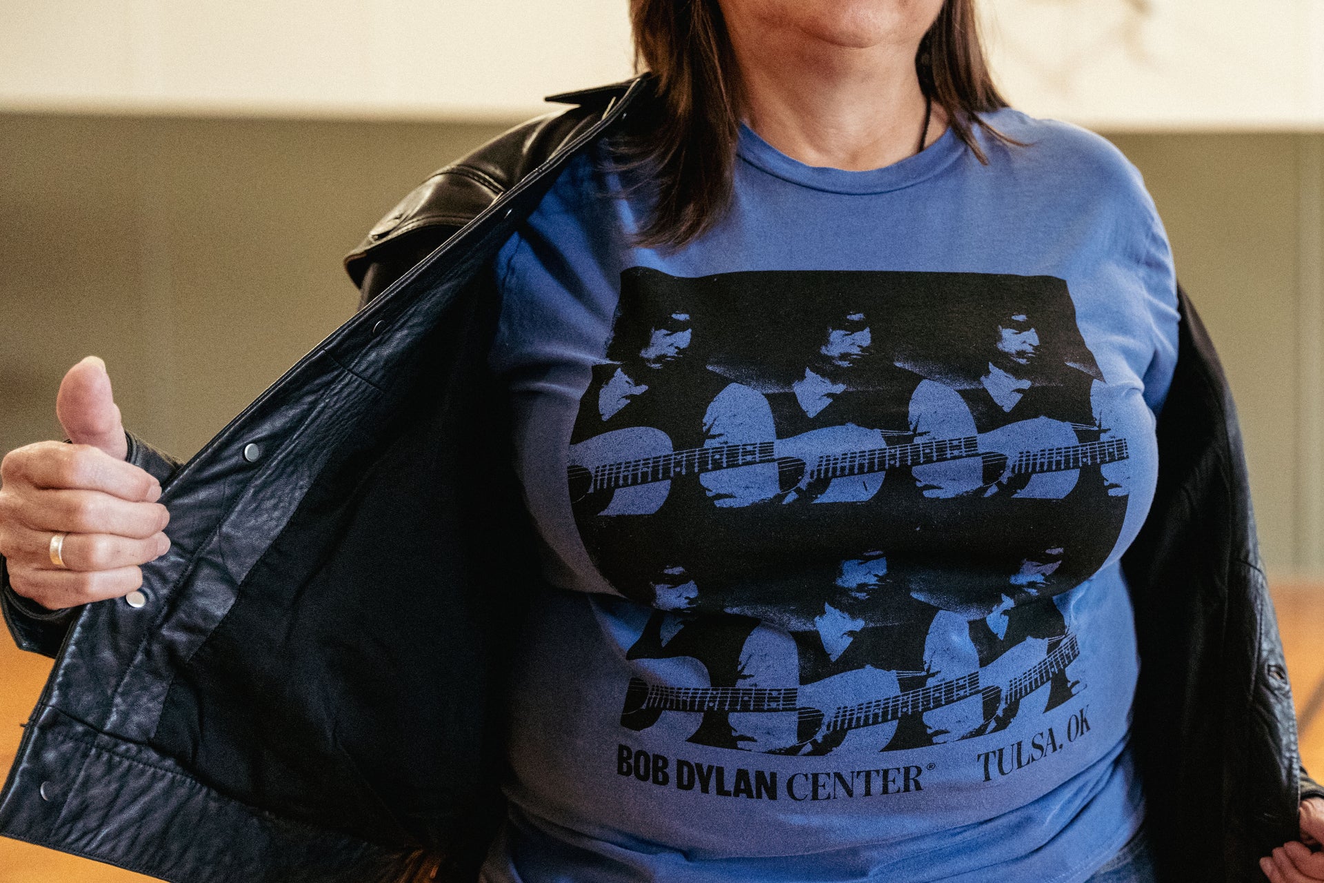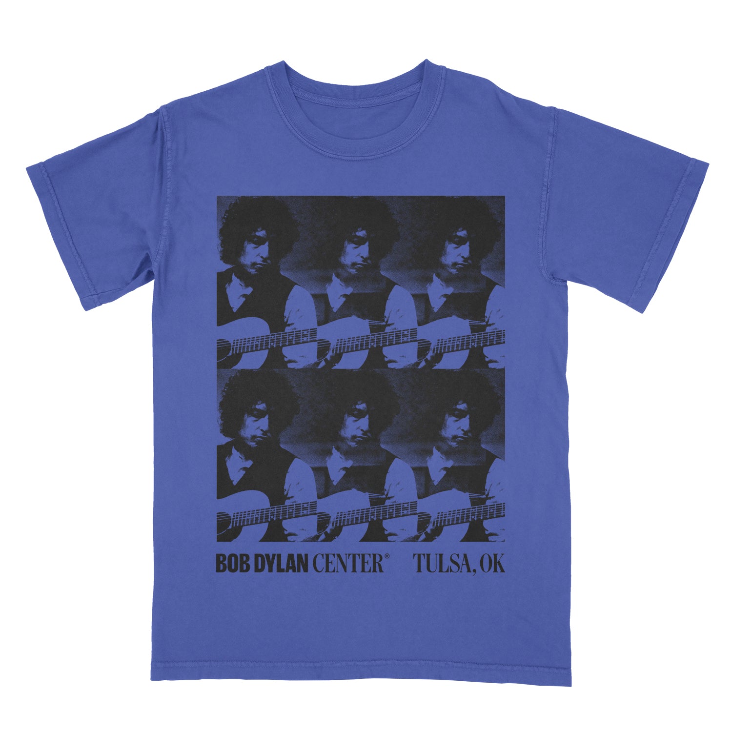 This royal blue vintage-pigment dyed tee features a design from Tulsa graphic designer, Hank Hanewinkel III, utilizing a Bob Dylan Center archive portrait of Bob Dylan by Ken Regan.