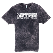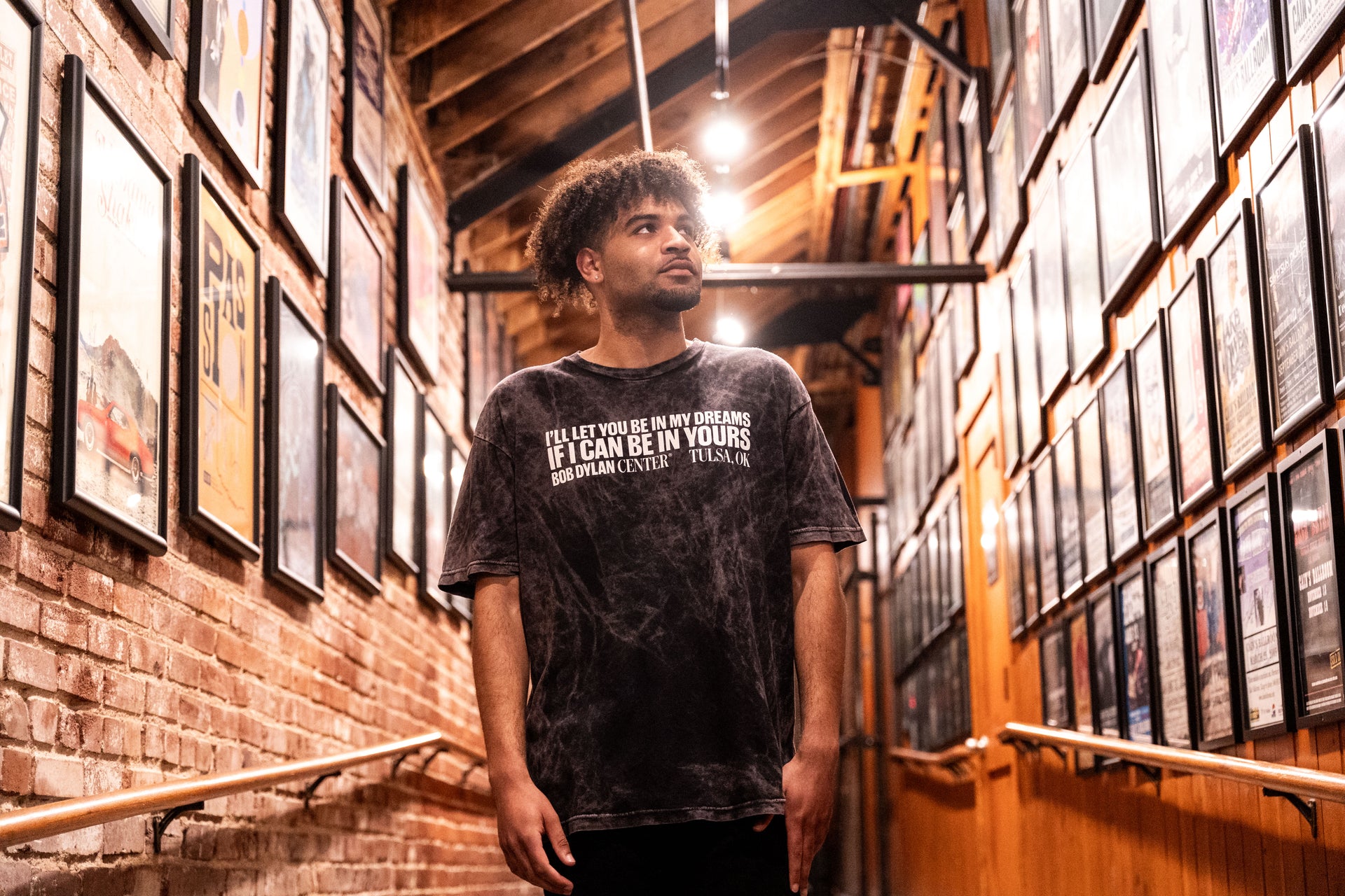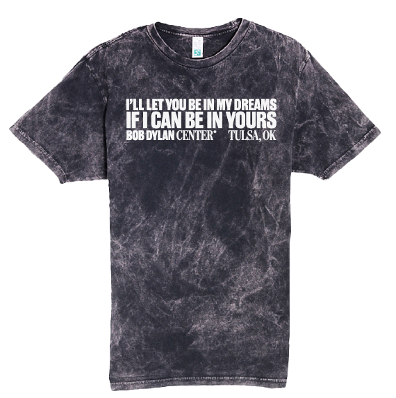 Our 100% cotton jersey Dreams Shirt features lyrics from Bob Dylan's song, Talkin' World War III Blues, which is also displayed on the Bob Dylan Center staircase. Each garment is unique with slight differences because of the special dye and mineral wash processes to create the vintage wash look.