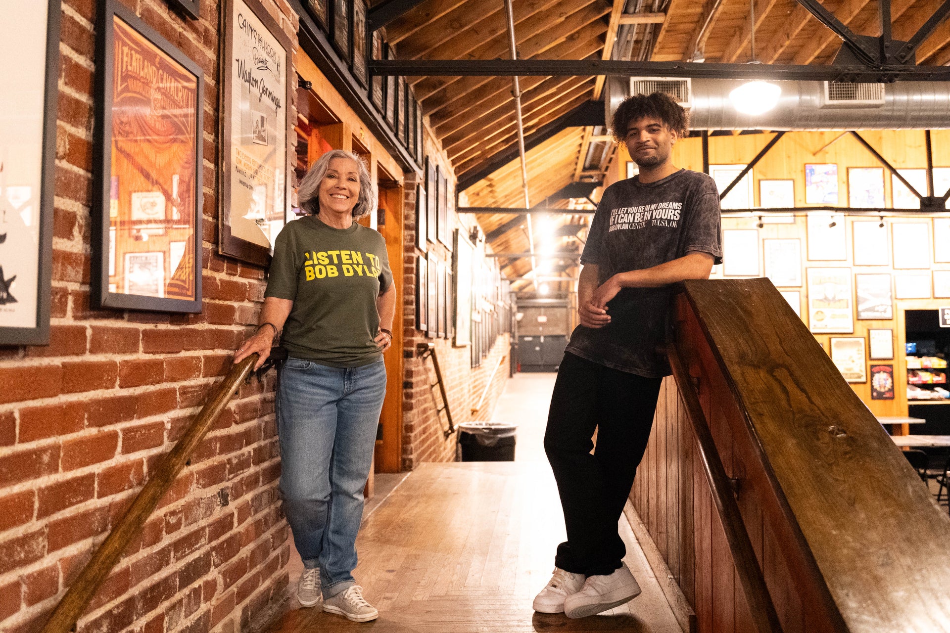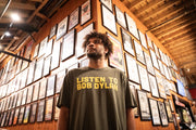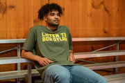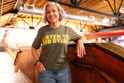 This 100% high quality cotton shirt is available in cypress. Our Listen to Bob Dylan design is screen-printed in bright gold. The Bob Dylan Center logo is print on the back.