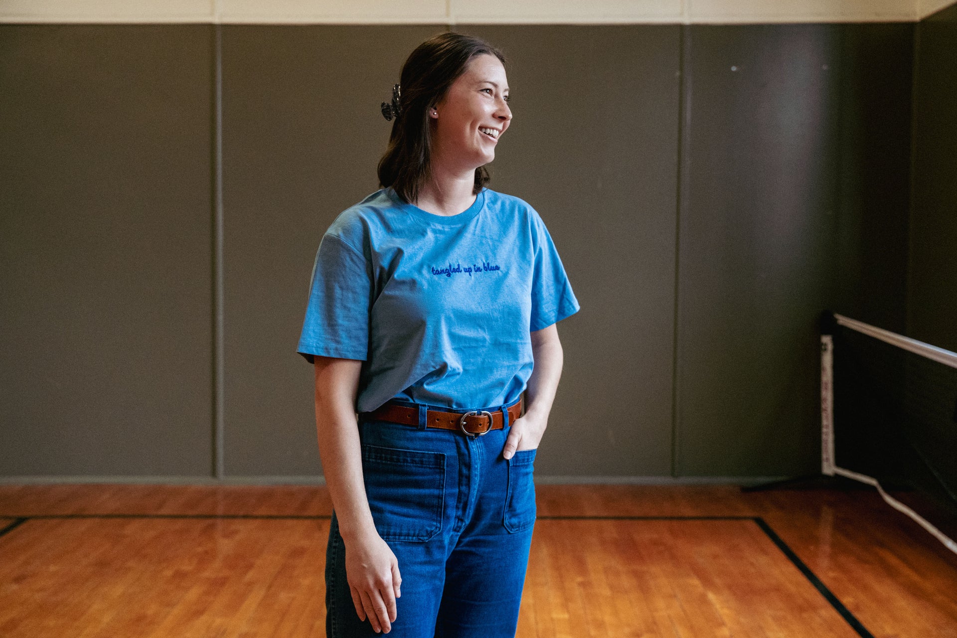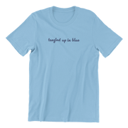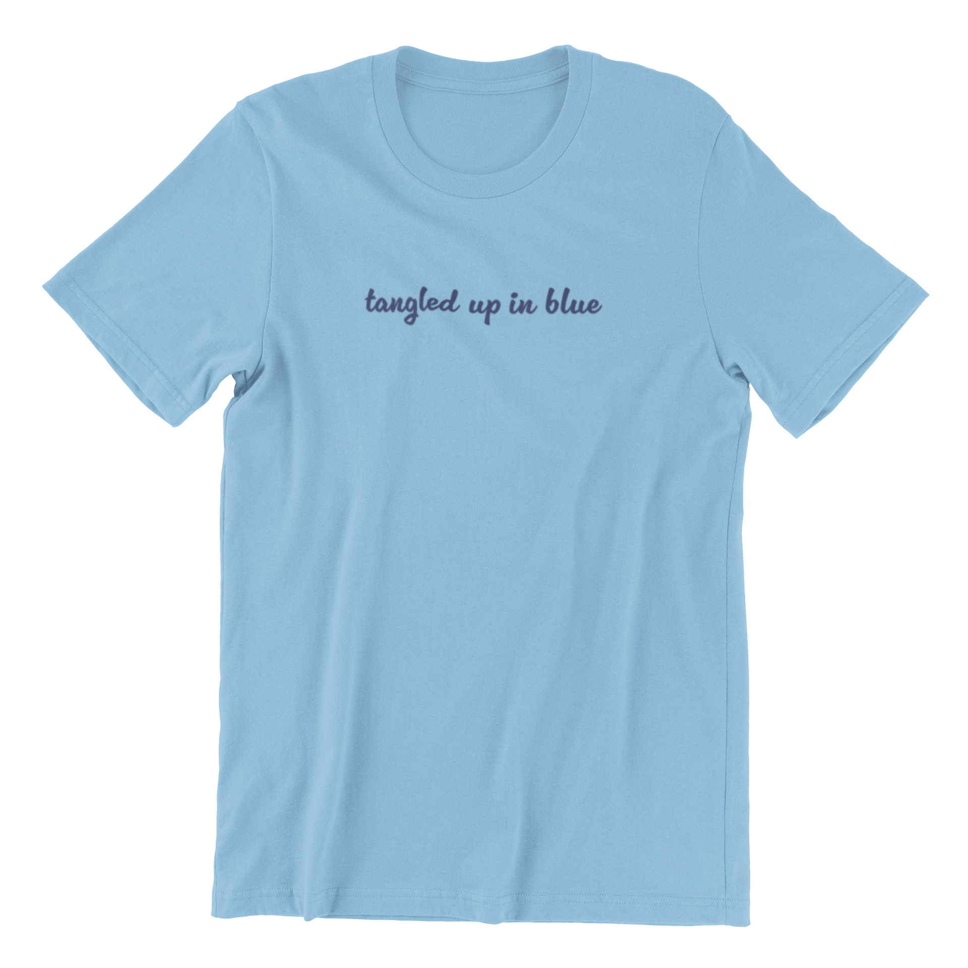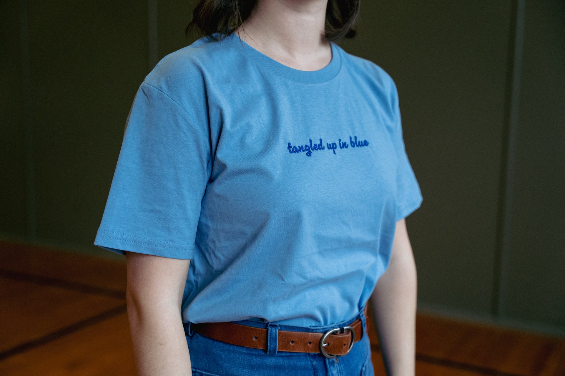 Our Tangled Up in Blue shirt commemorates one of Dylan's most iconic songs. Available in a soft blue, it features Tangled Up In Blue embroidered across the front in dark blue thread. Bob Dylan Center logo on the back.