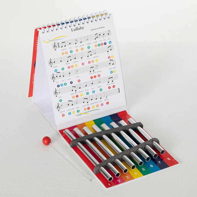A smaller version of the Chimalong, the Mini Chimalong comes attached to a beautifully illustrated full-color spiral-bound songbook. Folds easily for traveling. Mallet included.