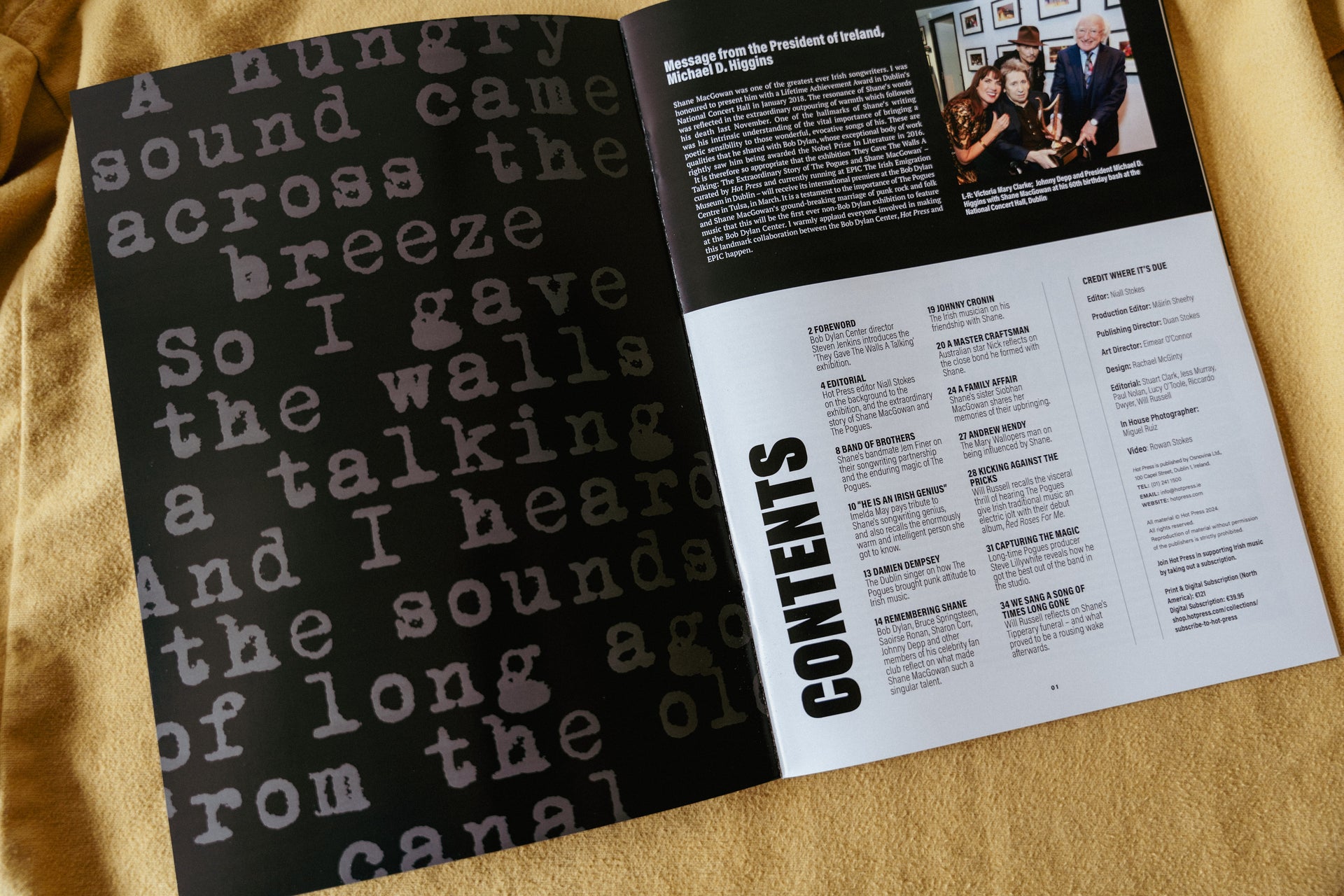 Ireland's Hot Press magazine has been at the heart of the extraordinary growth and development of Irish music over the past 40 plus years. The magazine enjoyed a special relationship with The Pogues and the band's main songwriter and frontman, Shane MacGowan - who appeared on the front cover eight times. It was against this backdrop that, in the latter half of 2023, Hot Press was approached by EPIC The Irish Emigration Museum to curate an exbition about the band. To coincide with the exhibition in Dublin, Hot Press produced a special issue of the magazine with numerous guest contributors. Following the sad death of Shane MacGowan on Nov. 30, 2023, additional material has been written for this unique special publication, created specially for the run of 'They Gave The Walls A Talking' at the Bob Dylan Center.